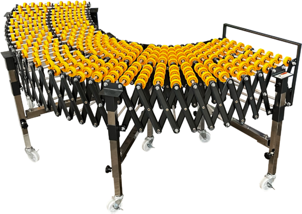 Fleksibel gravitasjonstransportør, justerbar, min. 1100mm - max 5300mm, på hjul 500mm bredde. 48mm plastruller Maks høyde 900mm Min. høyde 600mm